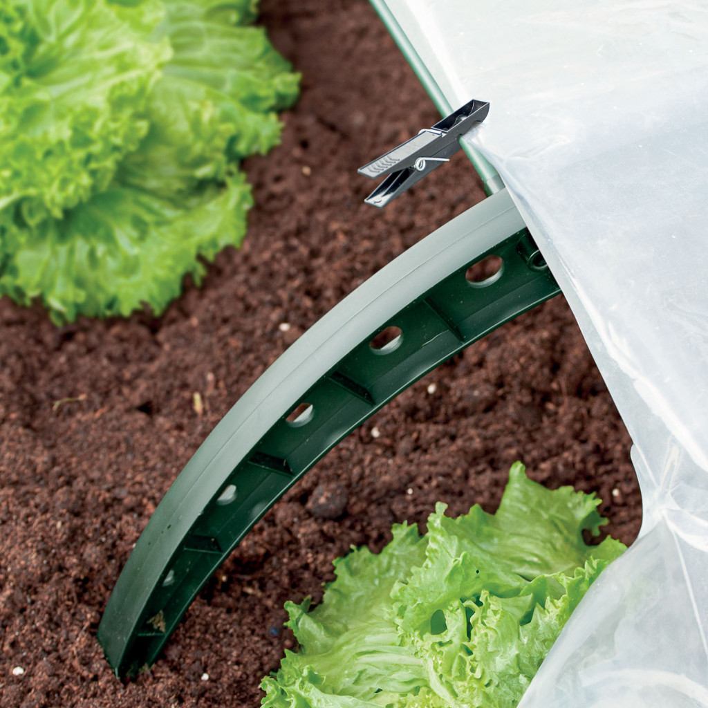 Az íves vázszerkezetre feszített, átlátszó fólia optimális mikroklímát biztosít a növények számára, miközben védi őket a hidegtől, széltől, esőtől és kártevőktől. A fólia jól átereszti a napfényt, így elősegíti a gyorsabb növekedést és a korábbi terméshozamot biztosít, az alumínium fűzőlyukaknak köszönhetően egyszerűen telepíthető.