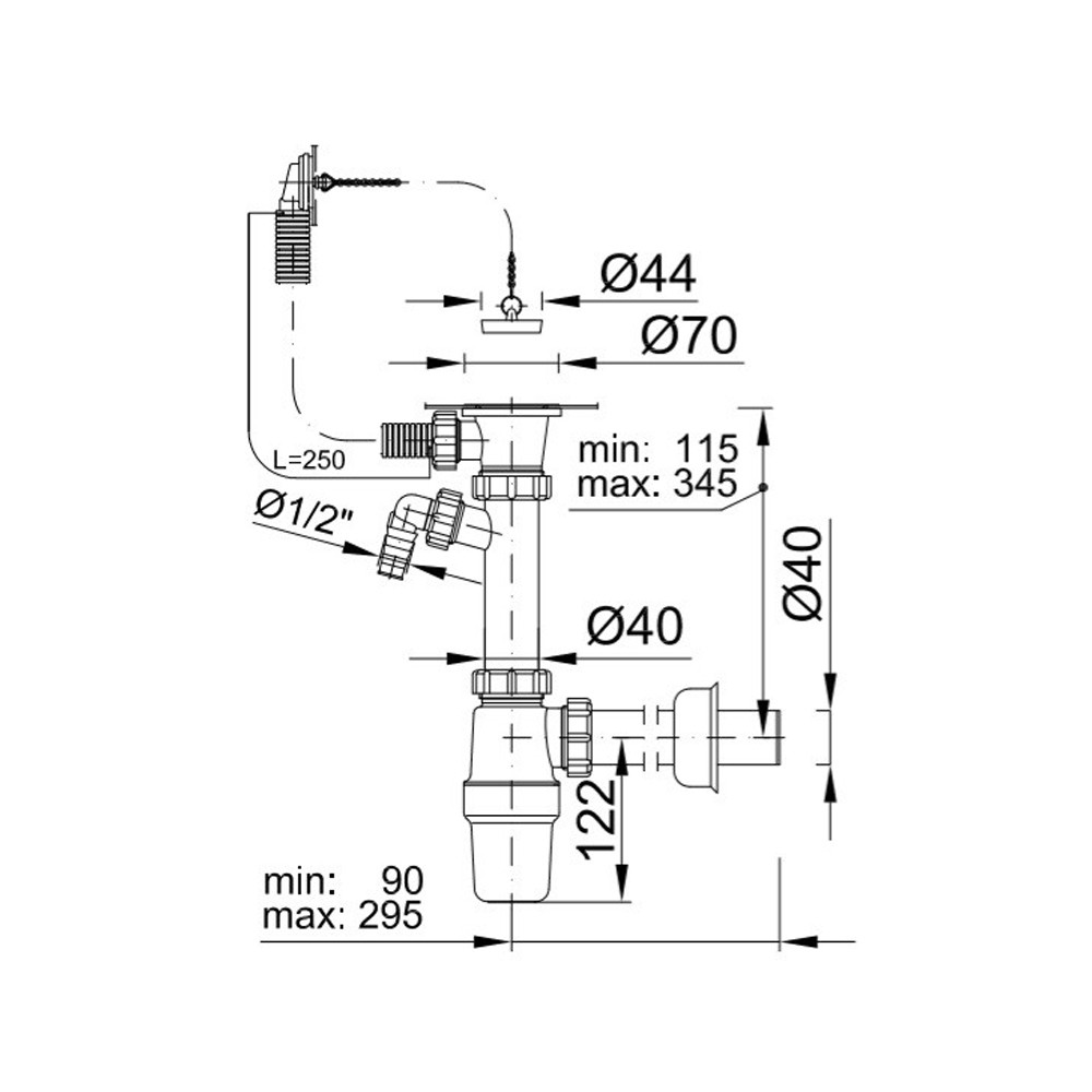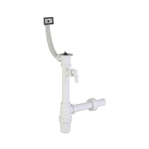 Egymedencés mosogatószifon, túlfolyóval, mosogatógép csatlakozóval, leeresztőszeleppel, 40 mm-es elfolyással.